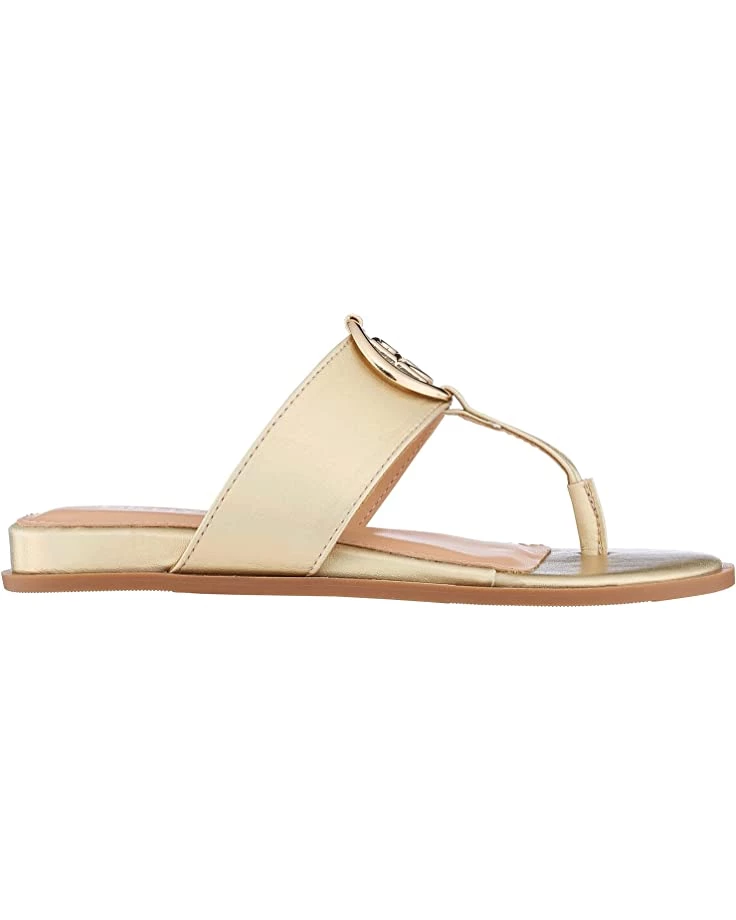 - Flat sandals featuring T-strap PU upper with metallic hardware detailing.