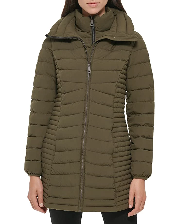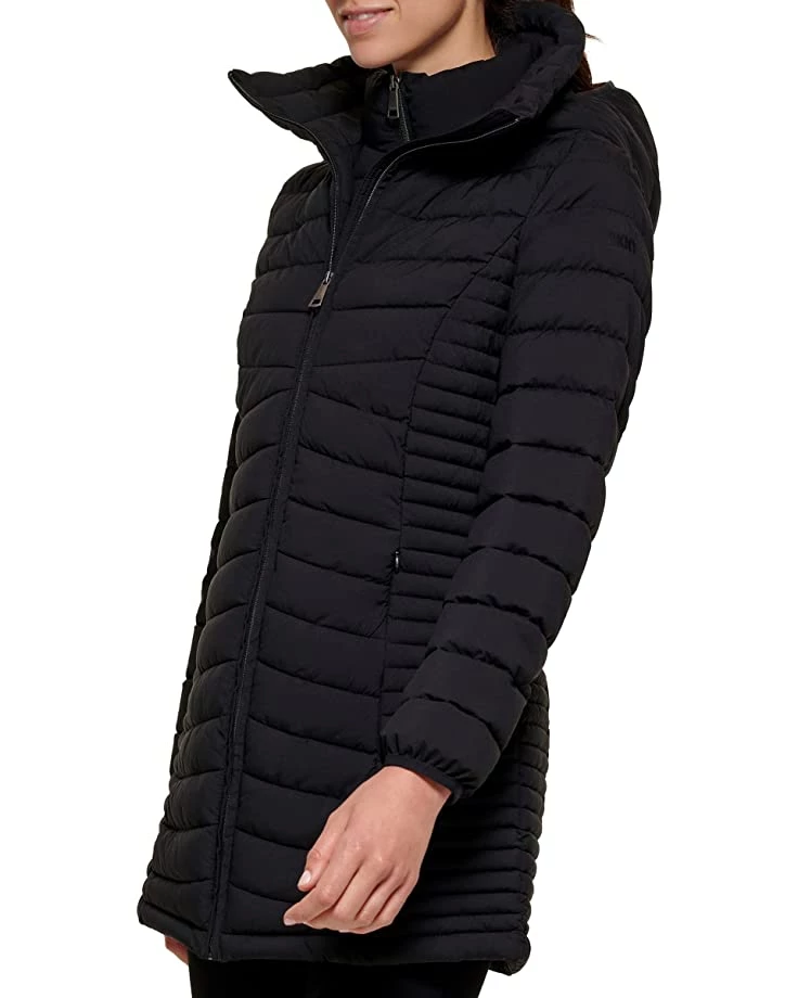 - Keep it cozy in the lightweight comfort of DKNY® Packable Bib Front Jacket.