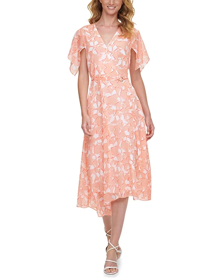 - DKNY® Printed Short Sleeve Front Wrap Dress looks elegant and stylish enough to be worn on special outings!