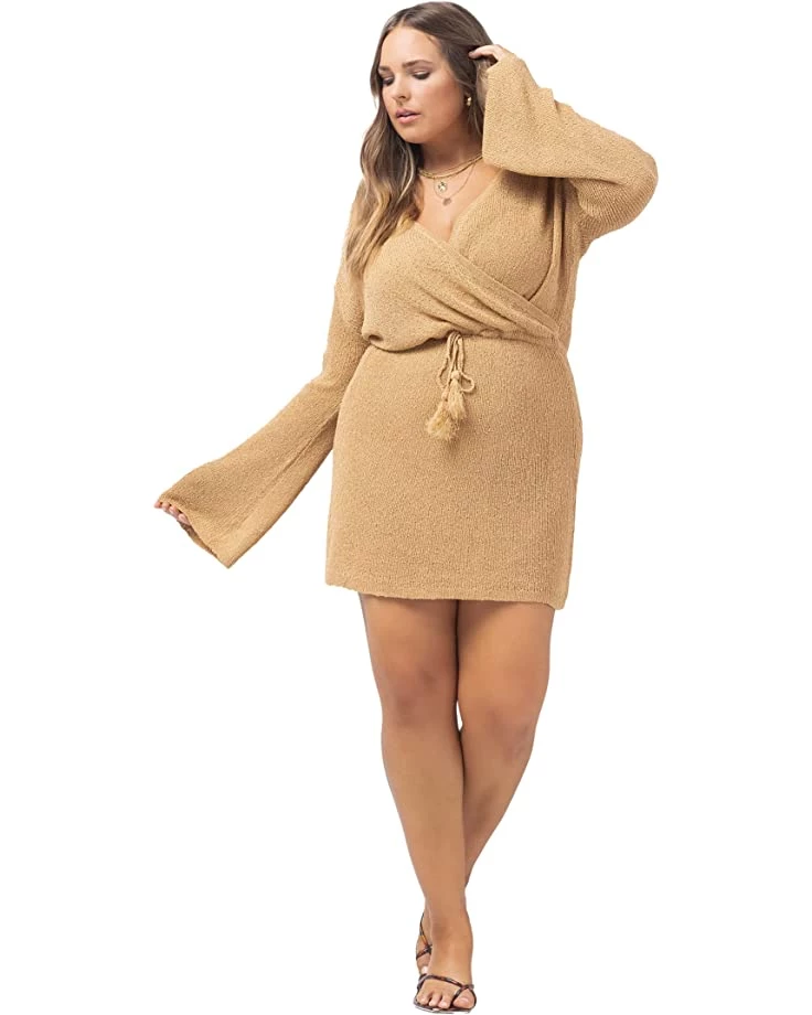 - The sheer L*Space® Topanga Dress will cover your swimsuit in stylishly. This dress showcases a wrap V-neckline, drawstrng adjustable waistline, and long bell sleeves.